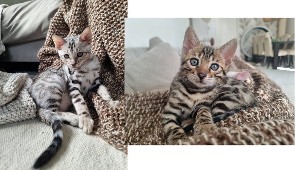 House of Bengal -kissalassa on vapaana kaksi aivan ihanaa poikapentua, ruskeatäplikäs ja hopeatäplikäs sydäntenmurskaaja. Pennut ovat lajityypilliseen tapaan sosiaalisia, leikkisiä ja uteliaita. Pojat viihtyvät myös sylissä kehräten, kun sinne itse hakeutuvat, ja osallistuvat mielellään kaikkeen puuhasteluun.