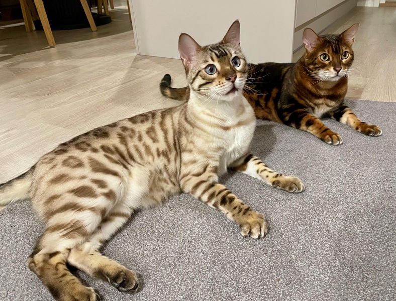 Ruskeamarmori. Herkkusuu, joka tykkää piilotteluleikeistä, lintujen katselusta ja varsinkin talvella sylissä olosta. Hieman rauhallisempi luonne bengaliksi.